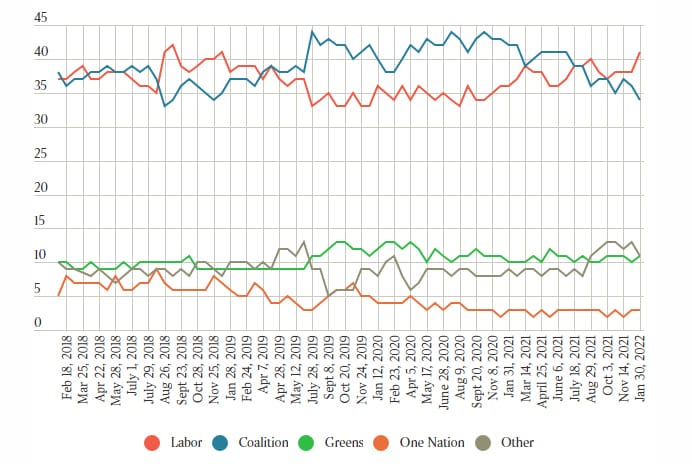 With a two-point fall in primary vote support for independents and minor parties to 11 per cent, the poll produced a two-party-preferred lead for Labor of 56-44 – the largest margin for the opposition since September 2018 – and a six-point blowout on the 53-47 recorded in the final poll of 2021 published on December 6.
