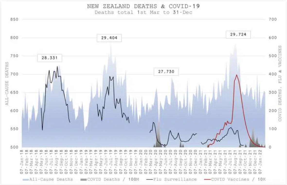 The following graph of New Zealand all-cause mortality, mRNA vaccination, flu rates, and Covid deaths speaks for itself. Even our data shy politicians should be able to read this one correctly.