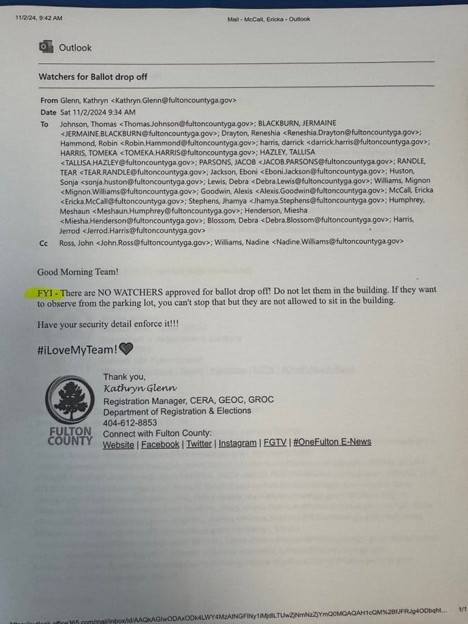 Georgia Republican Party Chair in Georgia produces a letter instructing banning of poll watchers are banned from observing ballot drop-offs.