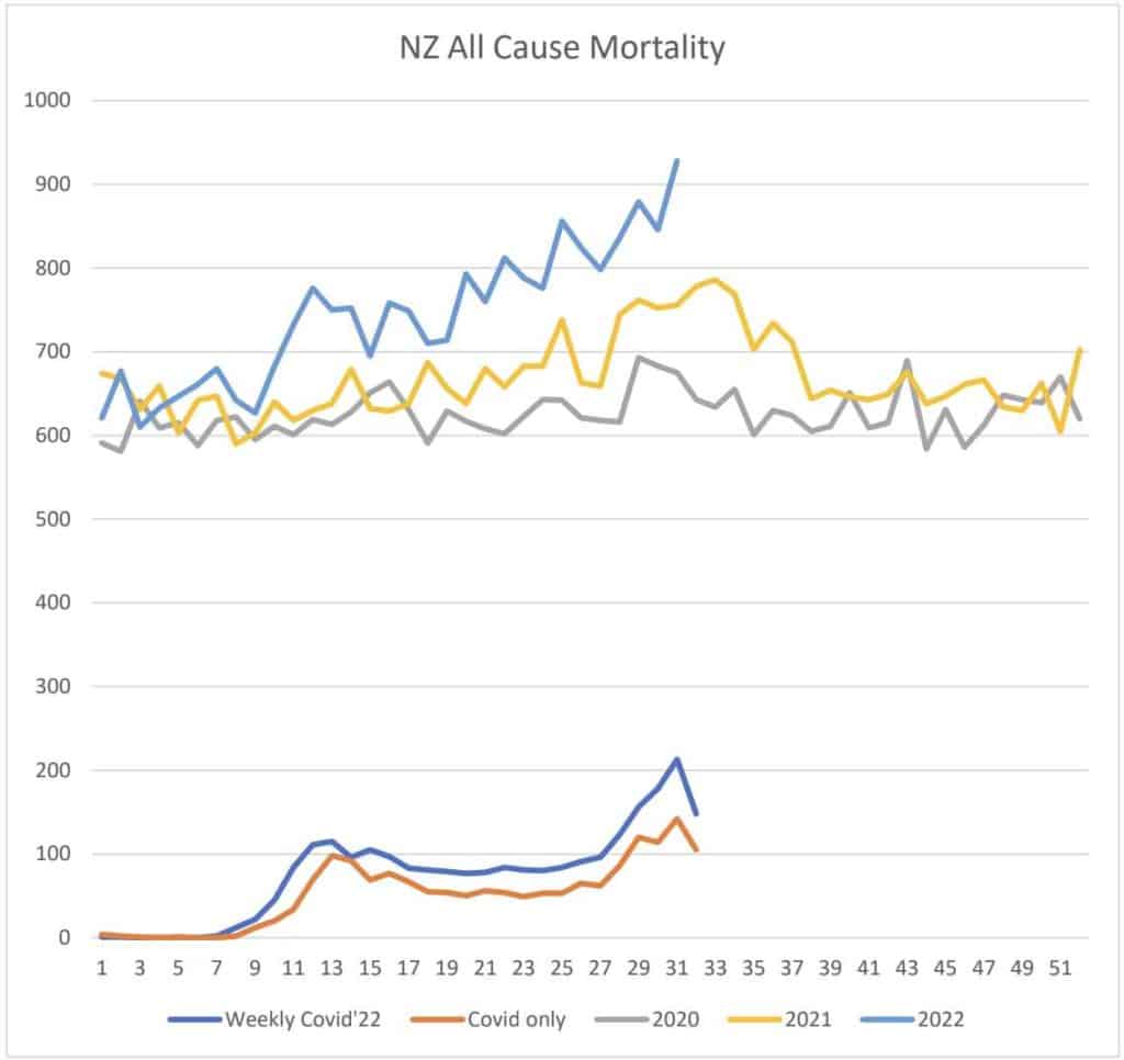 Here is a comparison of New Zealand’s weekly all-cause deaths 2020-2022. The official Ministry of Health Covid weekly death tally for 2022 is also graphed on the same axis.