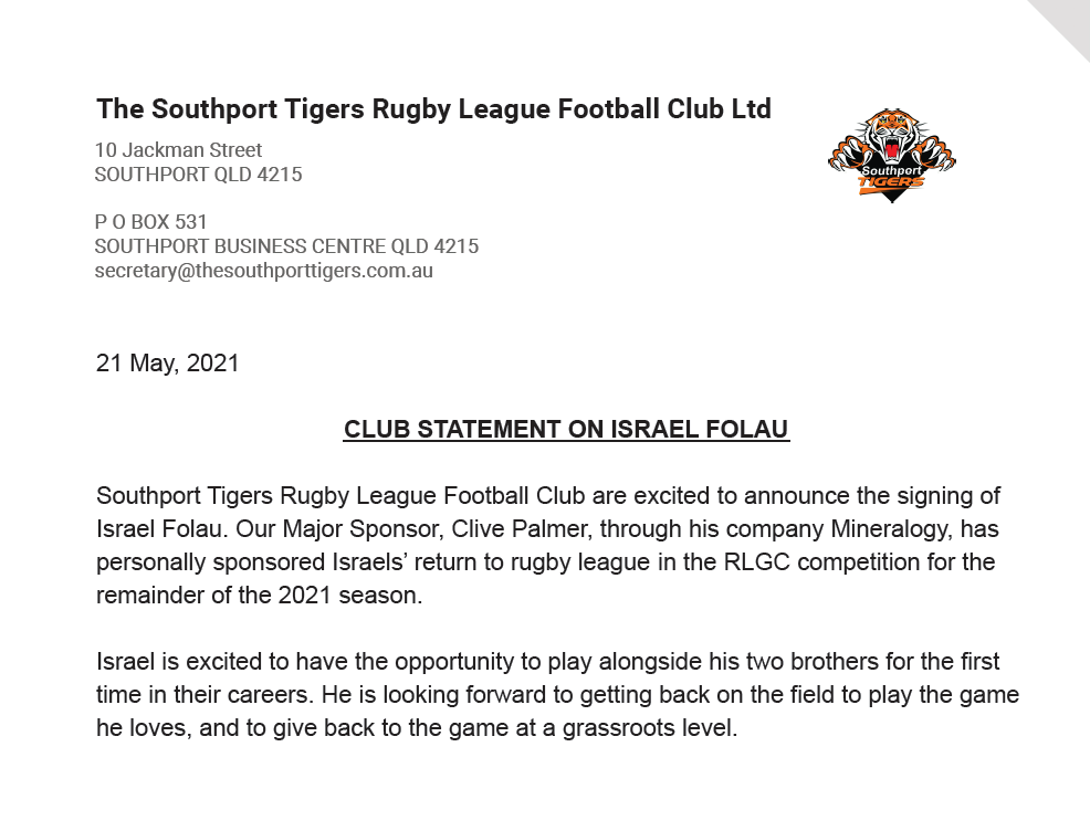 Israel Folau has been signed to play rugby league again with the Southport Tigers in the Gold Coast A Grade competition.