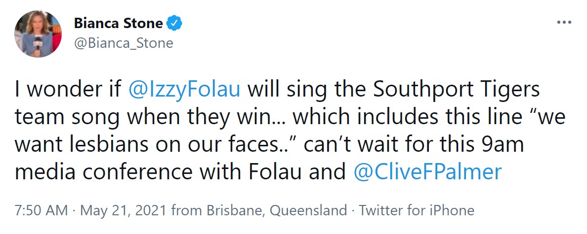 Channel Seven’s Bianca Stone tweeted sexually explicit, homophobic and misogynistic words she claimed were part of the Southport Tigers’ “team song”, which was then brought up in the press conference, and became the preferred headline around the nation.