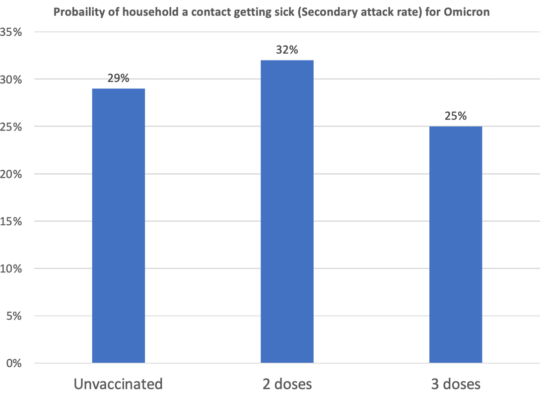 A number of studies are converging on the fact that 2 doses of vaccination has poor vaccine effectiveness against Omicron. 3 doses does slightly better, but the effect will rapidly wane as antibody titers fall, and infection is certain as the number of exposures increase. These studies have immediate implications for vaccine and health-care policies.