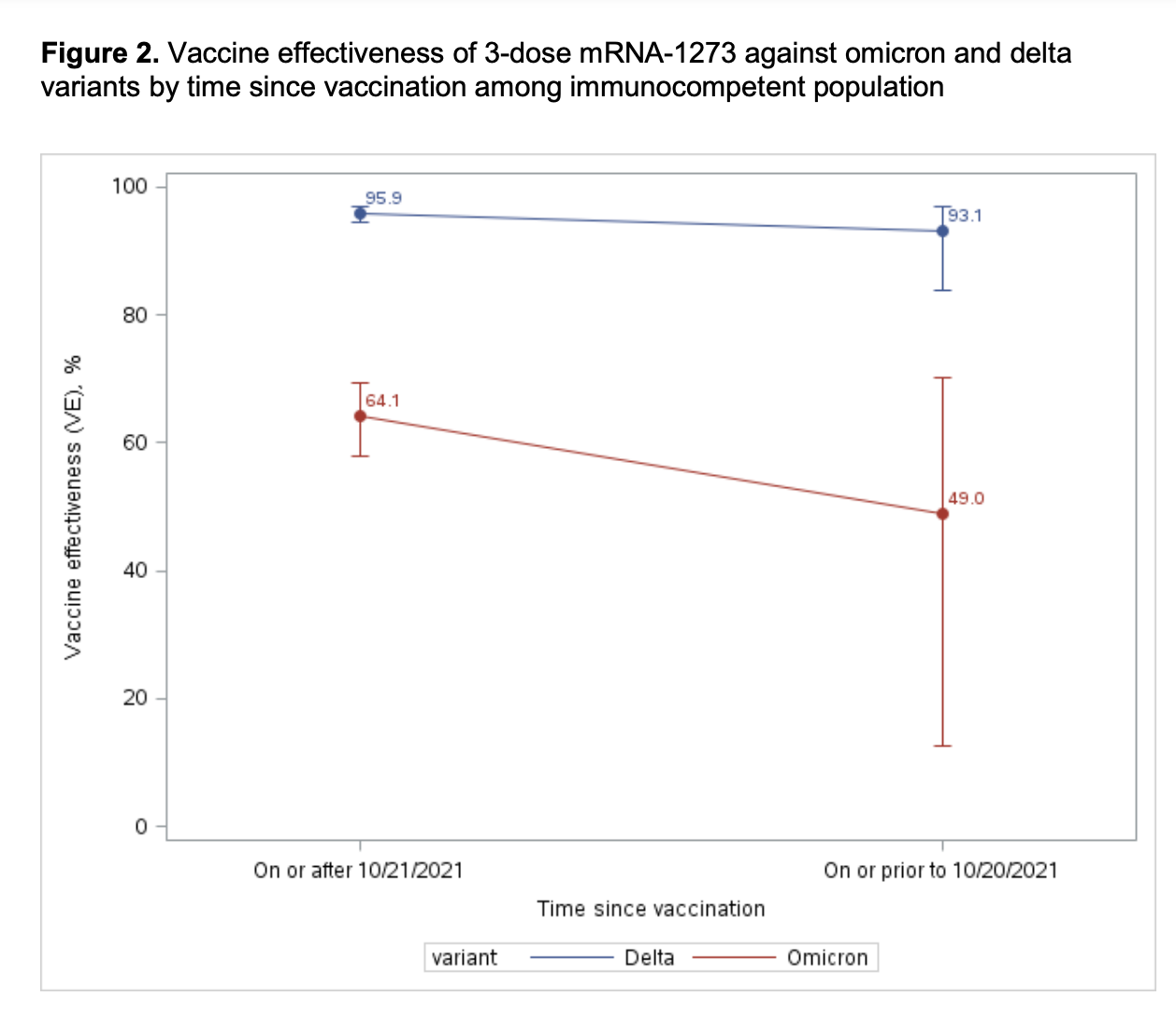 Now, let’s turn to the Province of Ontario, vaccine effectiveness 2 dose or 3 dose is in the toilet; Note the y axis, and broad confidence interval post dose 3. Here dose 3 would fail to meet the FDA standard of at least 50% VE, with lower bound CI >30%— the standard for EUA.