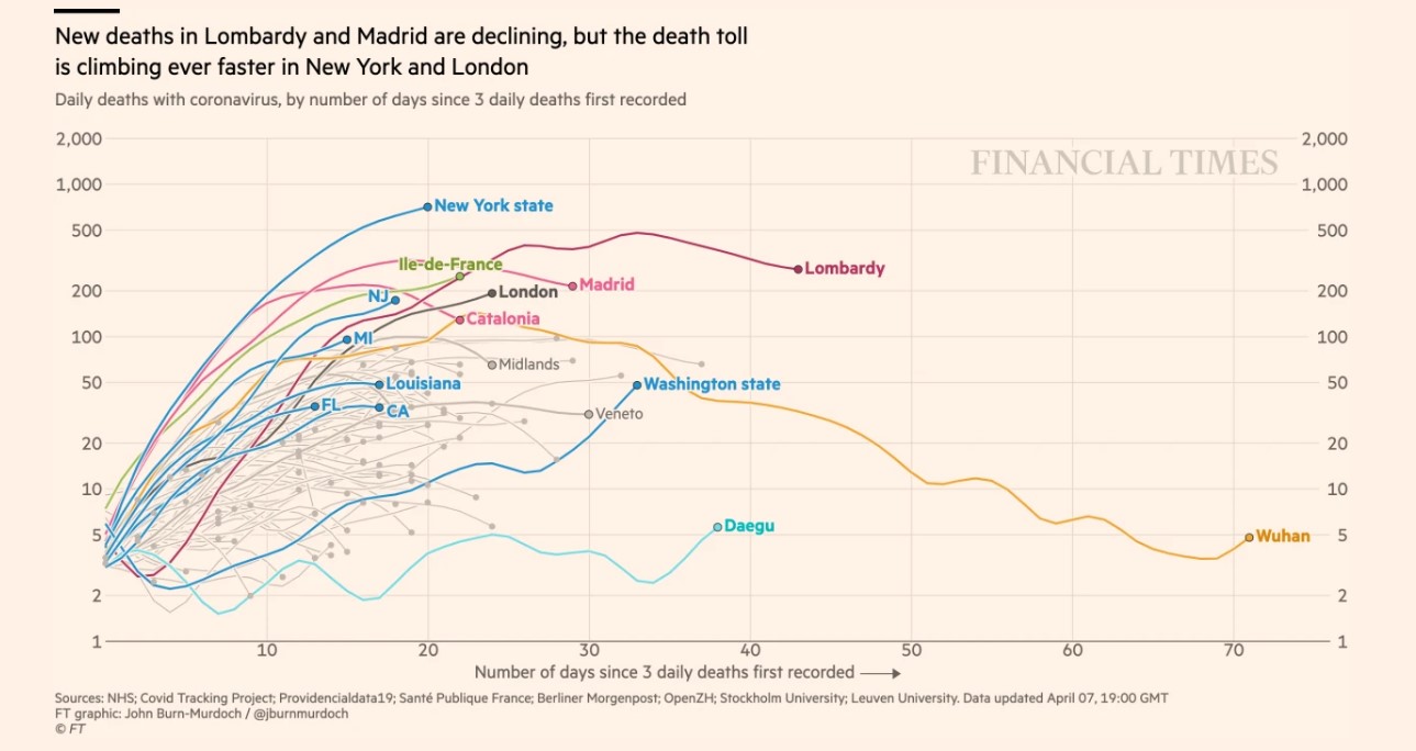 The Financial Times has a bunch of COVID-19 graphs in an article. Here is one.