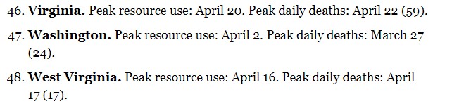 How are the model predictions going? When will Washington state expect the peak number of deaths? Maybe 50 is just around the corner? Here is the answer from an article titled ‘Pandemic’s Peak – Here’s The Date for Your State‘.