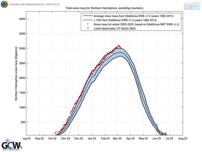As on March 6, it seems that there was approximately 3,100 gigatonnes of the white stuff still around, about 11% more than the average amount for 1982-2012 and well outside the plus/minus one standard deviation range.