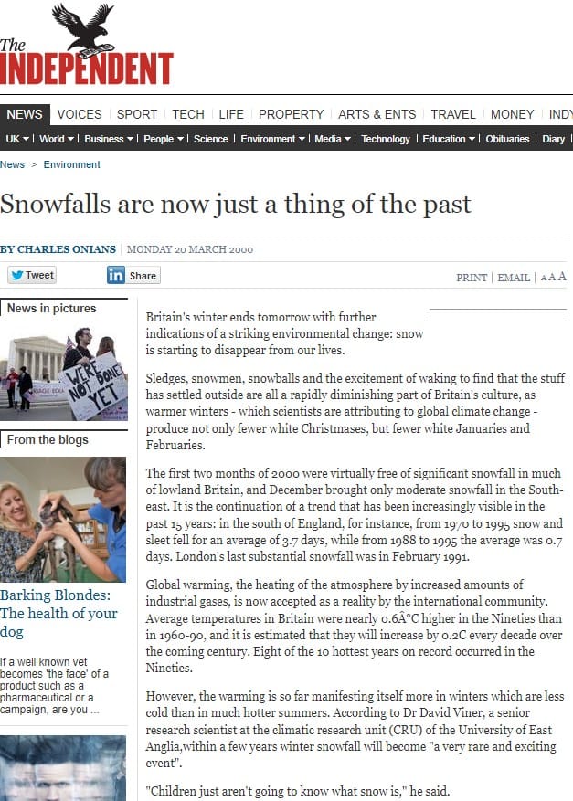 After all, Dr David Viner, was a senior research scientist at the climatic research unit (CRU) of the University of East Anglia when he made this prediction and he was a qualified expert in the field, so he should know.