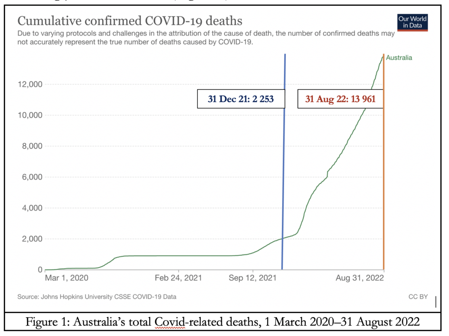 Yet in the UK: “The effects of lockdown may now be killing more people than are dying of Covid.” An editorial in the Telegraph emphasized the importance of establishing why a meaningful cost-benefit analysis of Covid policy was not carried out. Former UK Supreme Court Justice Lord Sumption describes lockdown as “an experiment in authoritarian government unmatched in our history even in wartime.” Australia’s vaunted success in controlling the pandemic in 2020–21, meanwhile, looks increasingly hollow in 2022 (Figure 1).