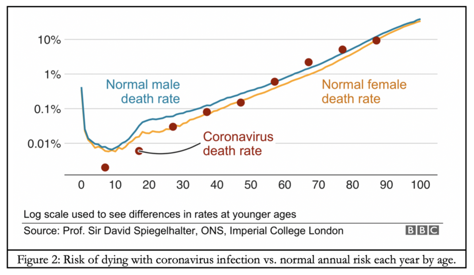 The BBC reported on May 7, 2020 that in England and Wales, there were only around 300 deaths in under-45s compared to around 24,000 in over-65s. Older people with pre-existing health conditions were the most at risk, as shown in a visually striking age-adjusted graph from the BBC (Figure 2). For those under 20, the risk is negligible. In October 2020, the Great Barrington Declaration – with 932,500 signatories currently, including 63,100 doctors and medical and public health scientists – noted that the mortality risk of Covid in the young was a thousand-fold less than in the old and infirm.