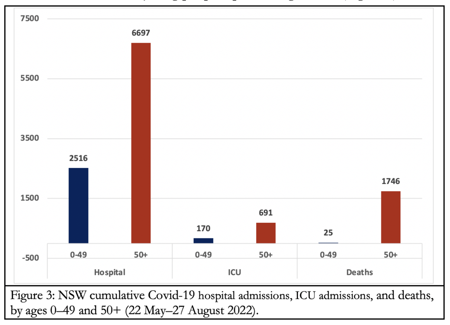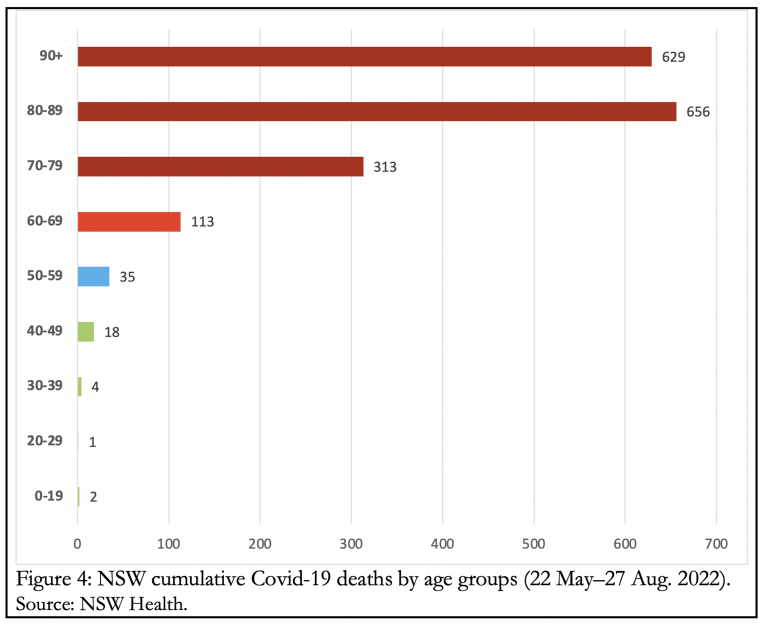 This would appear to rule out provisional vaccine approval for children below five, as shown in the empirical data from New South Wales (NSW). The resilience of the under-50s can be seen in Figure 3. In the 14-week period May 22–August 27, they made up 27.3% of Covid-related hospitalization and 19.7% of ICU admissions, but only 1.4% of deaths. In the same period, just 0.11% of all Covid-related deaths in NSW were children and young people up to the age of 19 (Figure 4).