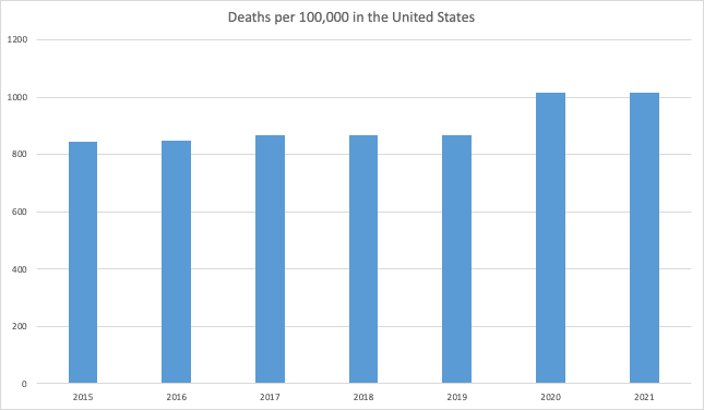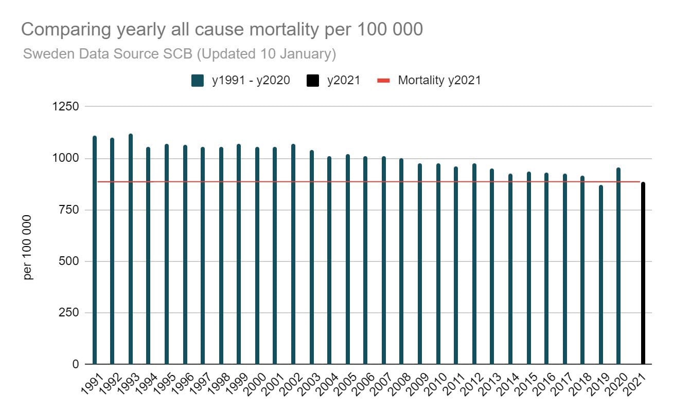 We see an increase in overall mortality in 2020 and 2021 that is significantly bigger than that seen in Sweden. In Sweden, the relative increase in overall mortality for 2020-2021, when compared with the preceding five years, is 1% (from an average of 900 deaths per 100,000 in 2015-2019 to an average of 912 deaths per 100,000 in 2020-2021).
