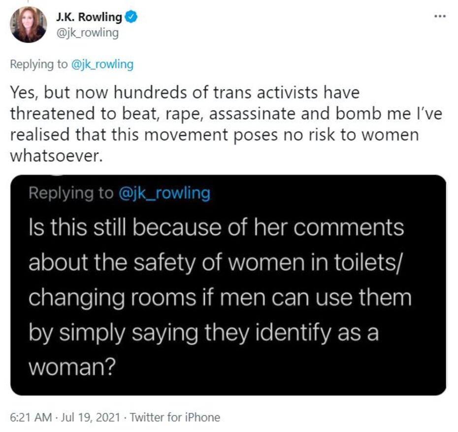 Rowling pretty cagy, though. She screenshotted a comment on the post and quoted it in an epic clap back to the authoritarian mob that works to silence her voice but claims to support “feminism”:
