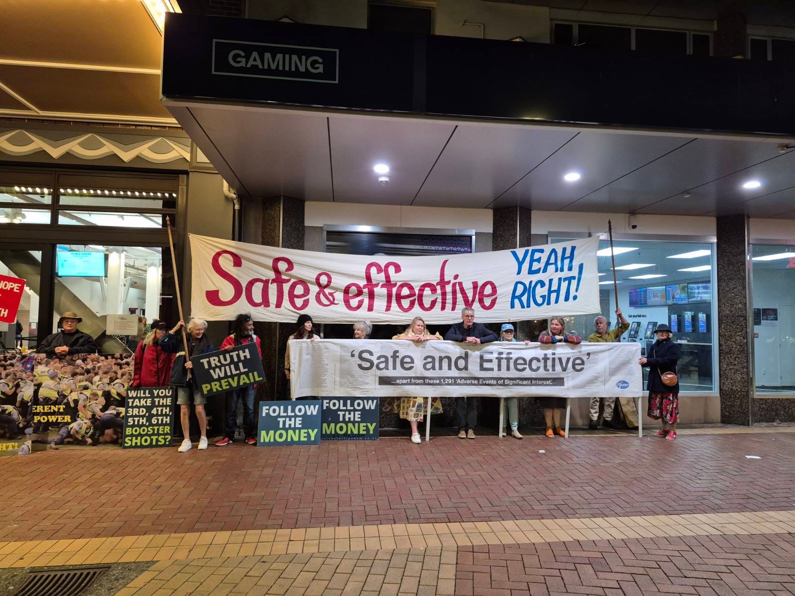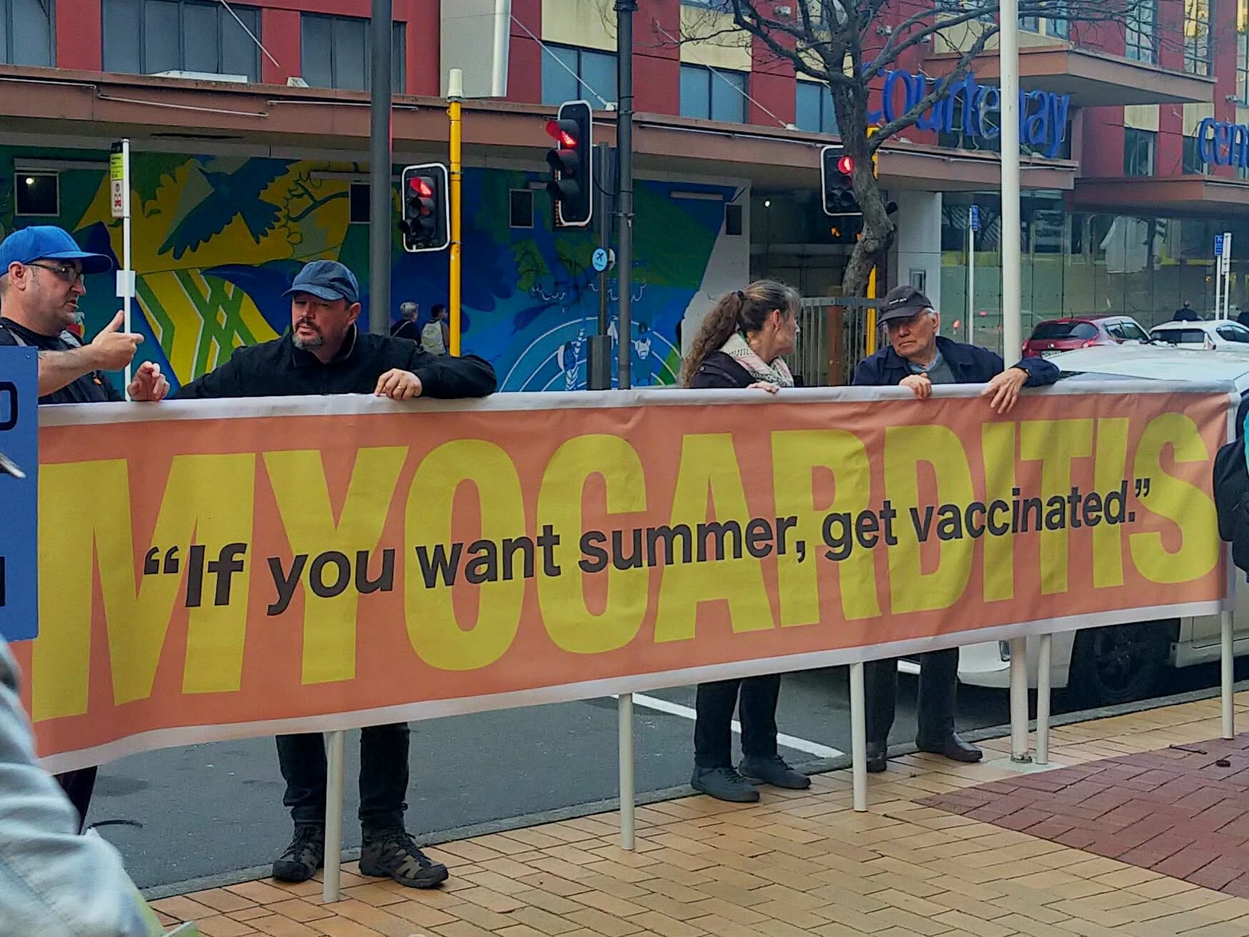 Banners on display included these: “Safe and effective. Yeah right!” “Safe and effective…apart from these 1291 adverse events of significant interest.” “If you want summer, get vaccinated (MYOCARDITIS).”