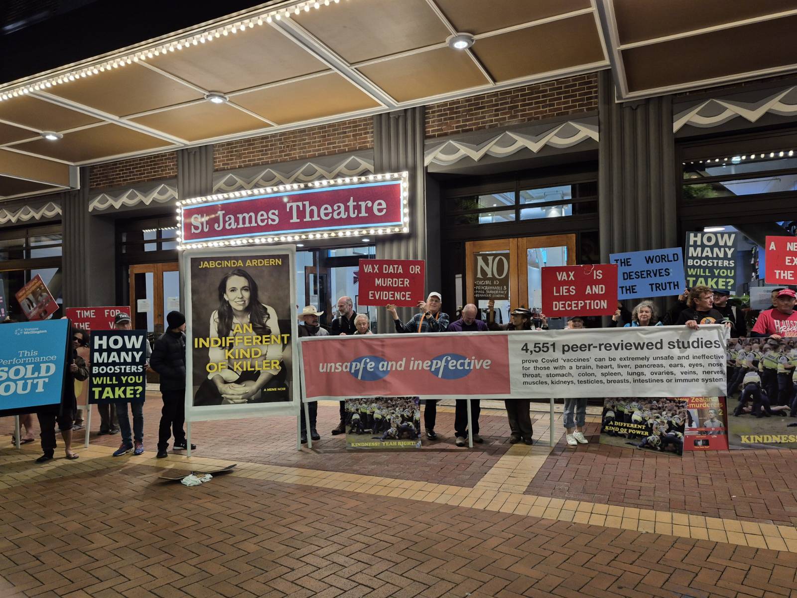 Outside the venue, around 50 protestors held signs and banners to remind the former prime minister of her destructive legacy; in particular, her pushing New Zealanders to take Covid-19 jabs, which led to vaccine injuries. It’s not known if Ms Ardern saw any of the messages herself but her supporters had plenty of time to take in the messages as the queue to enter the theatre moved at snail’s pace.