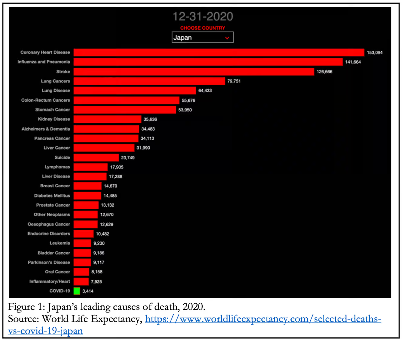 Covid-19 accounted for under 0.3 per cent of all deaths in Japan in 2020, well below the rates in Europe and the Americas which were the worst affected. More Japanese died from 25 other causes in 2020 (Figure 1), with seven times as many suicides, for example. Japan was also one of the few countries without excess mortality in the first year of the pandemic.