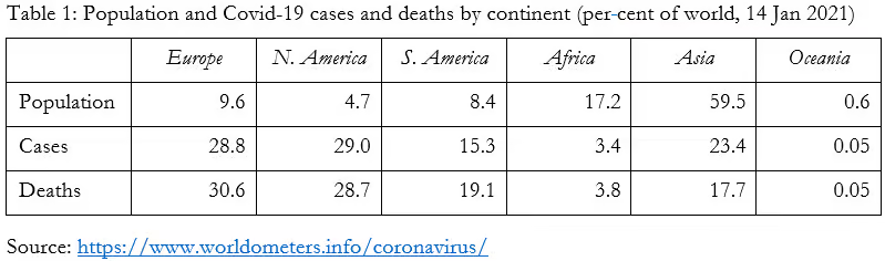 In 2020 Europe accounted for three times as many Covid deaths as its share of world population, North America six times, and South America 2.3 times (Table 1). By contrast Oceania had only one-twelfth, Africa one-fifth, and Asia one-third their respective shares of world population.