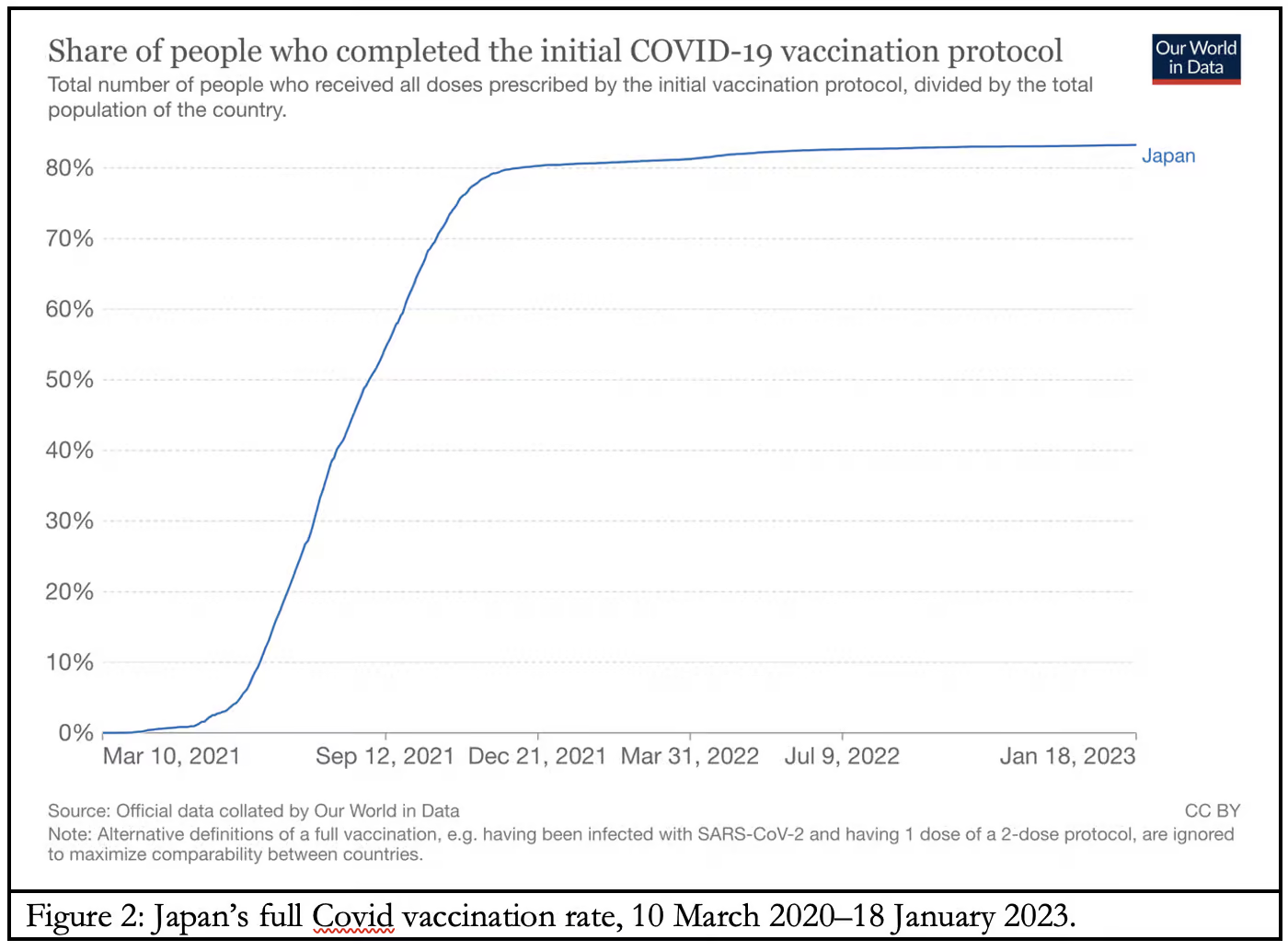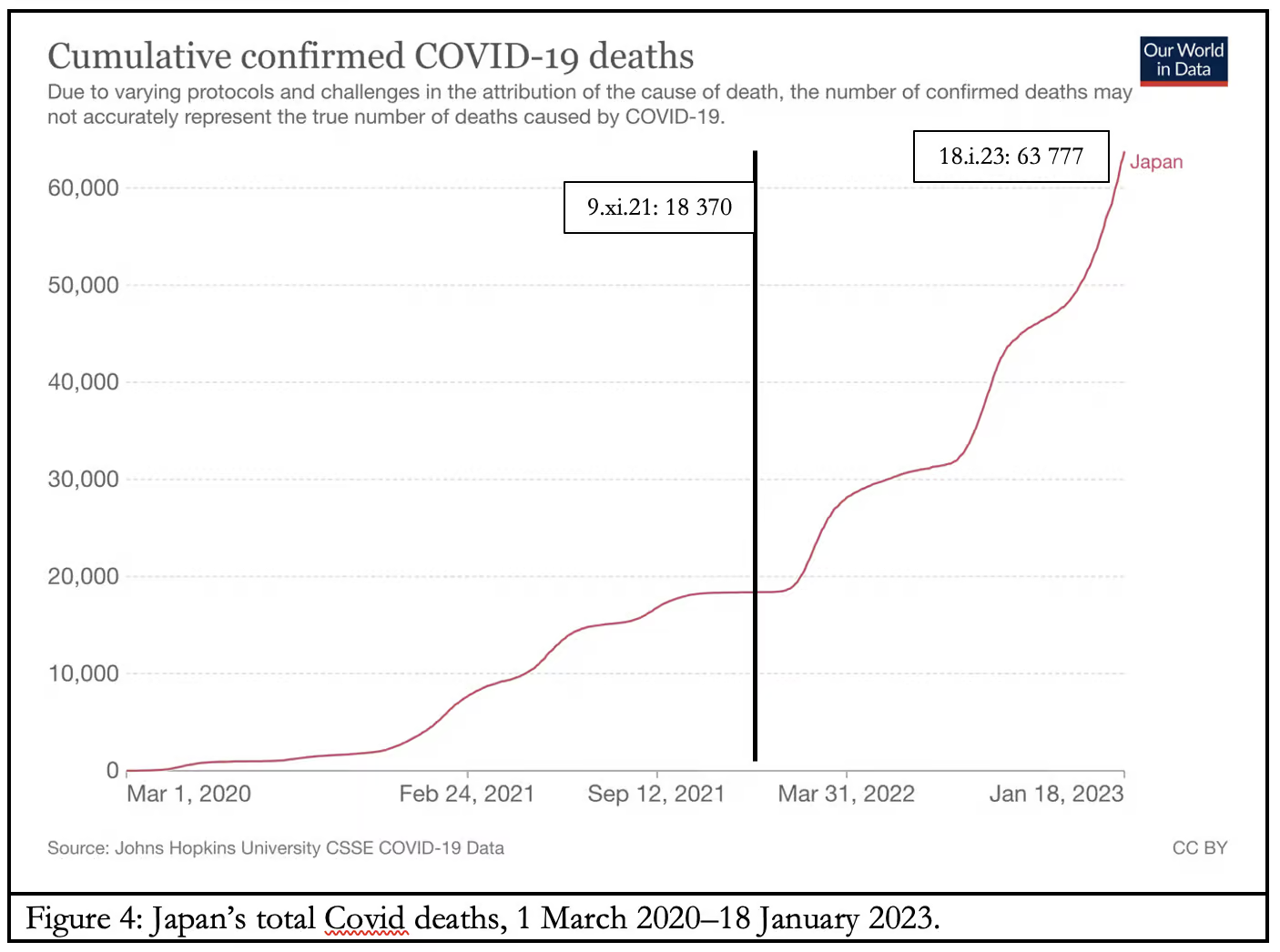 Japan hit 80 per cent full vaccination (which translates into over 90 per cent vaccination of adults) on 9 December 2021 when its Covid daily death rate was 0.01 per million. This had risen to 3.43 per million on 9 January 2023. Total deaths had increased from 18,370 to 63,777 over that period (Figure 4).