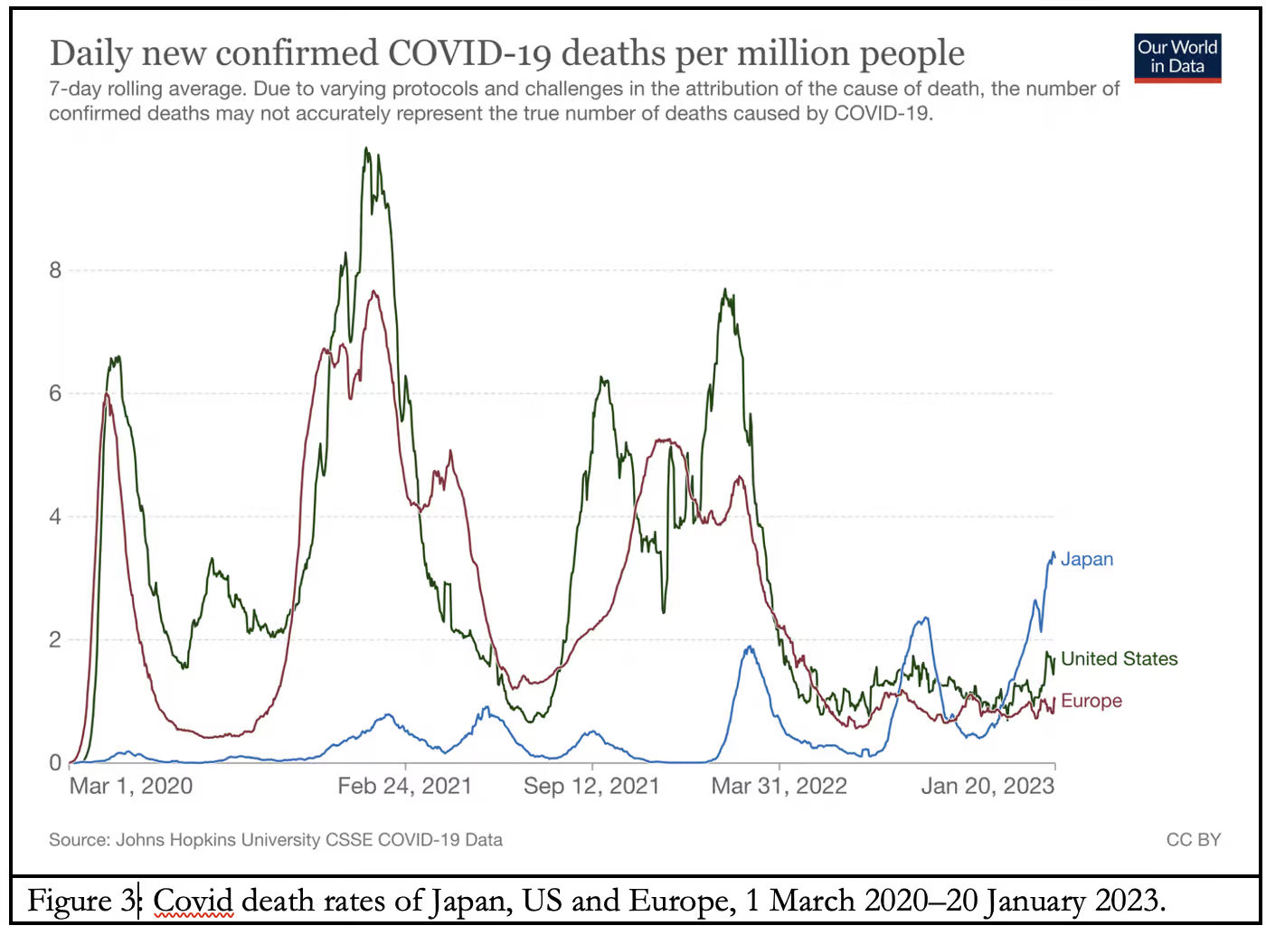 This created a pandemic of fear about the threat of Covid. When the Diamond Princess docked in Yokohama in early 2020 with 712 infected passengers in a total of 3,711 people on board, of whom 14 died, Kentaro Iwata of Kobe University described the cruise ship as a “Covid-19 mill.” The mainstream media was on a mission to cheerlead the lockdown narrative and countries like Sweden and Japan were the focus of attacks to discredit their departure from the approved narrative. Much of the Western media was harshly critical and predicted mass deaths that would ravage Japan.