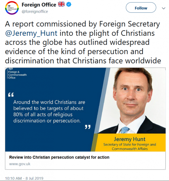 “When I became Foreign Secretary, I learned that almost a quarter of a billion Christians were still enduring persecution around the world. The evidence shows sadly that the situation is becoming worse. The number of countries where Christians suffer because of their faith rose from 128 in 2015 to 144 a year later. In the Middle East, the very survival of Christianity as a living religion is in doubt.”