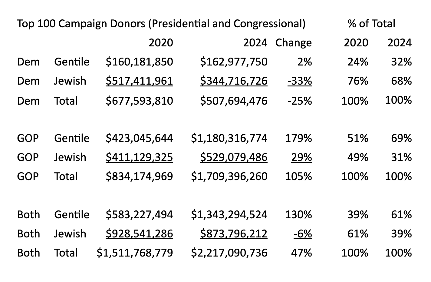 So, what’s the story? Firstly, that 2024 was not a good year for the Democrats when it came to big-money donors. Especially when it came to their former cash-cows: wealthy Jewish donors. Non-Jewish donations to the Democrats alone barely shifted. On the other hand, the share of donations from rich non-Jews giving to the Republicans or both parties boomed.