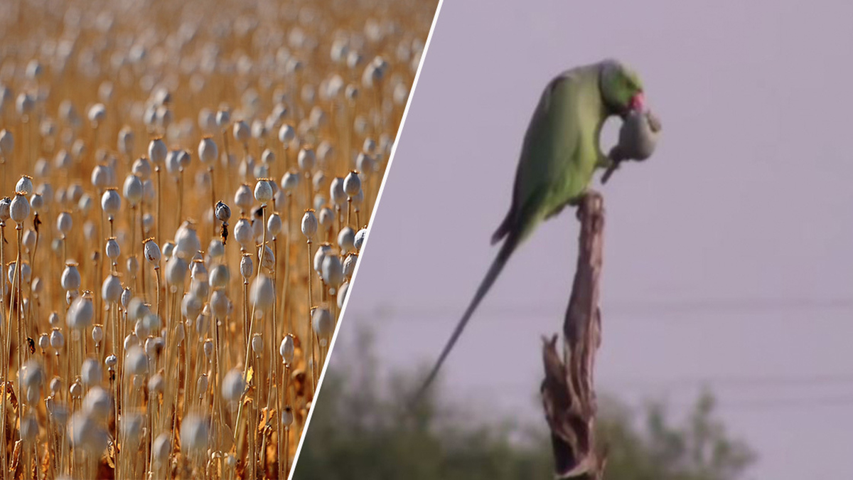 Farmers in Madhya Pradesh say their opium crops are being ruined by parrots who keep returning to raid their farms in an attempt to get high. The farmers have been guarding the fields day and night to protect their poppies, but the birds are willing to risk it all to get their beaks on the opium, which is being farmed for medical purposes.