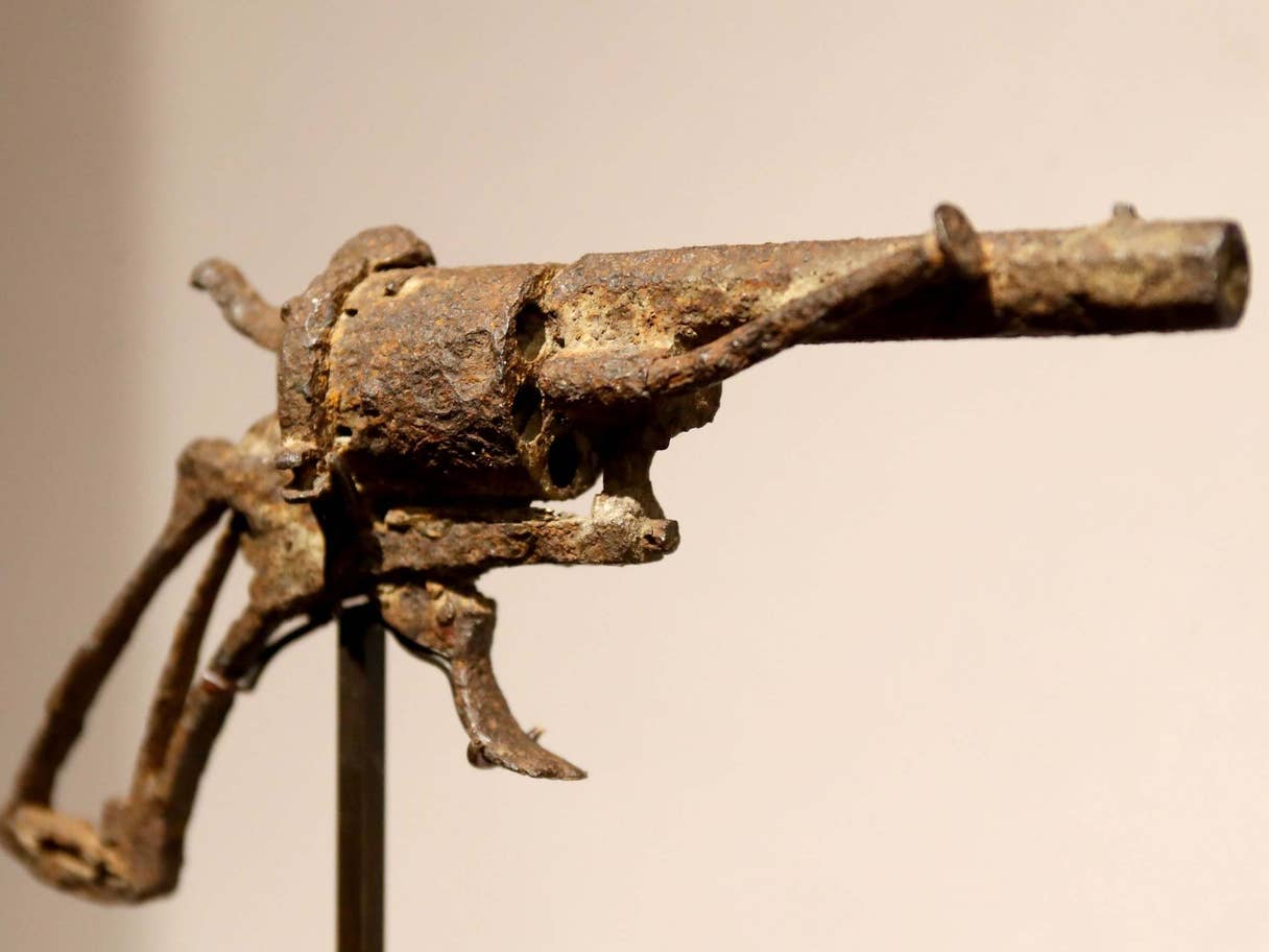 The pistol is a 7mm Lefaucheux pinfire revolver, it is in pretty bad condition and is believed to have spent some time buried before it was discovered by a farmer decades ago. The badly rusted and bent pinfire is missing its grip panels and is estimated to have spent more than 50 years in the ground before it was discovered.