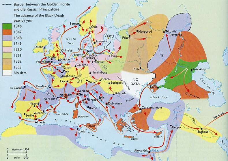 On its arrival in Europe, the plague spread with terrifying rapidity: easily 600 km in a fortnight by ship, and about 2 km per day along busy highways.