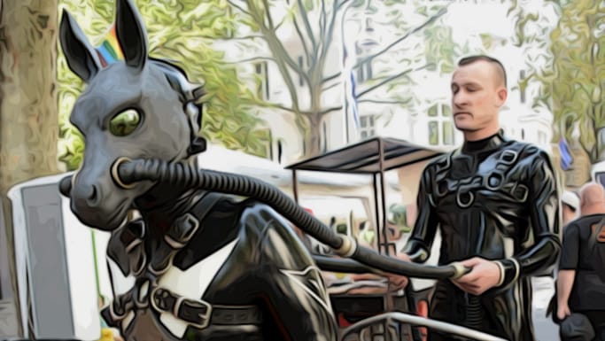 Darklands is a gay men’s leather fetish, spank, and sex festival. One of the highlights of Darklands is called “Mr. Puppy,” where gay men in leather parade around with gay men dressed as dogs on a leash in a Westminster-ish competition. #GayPride!