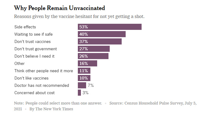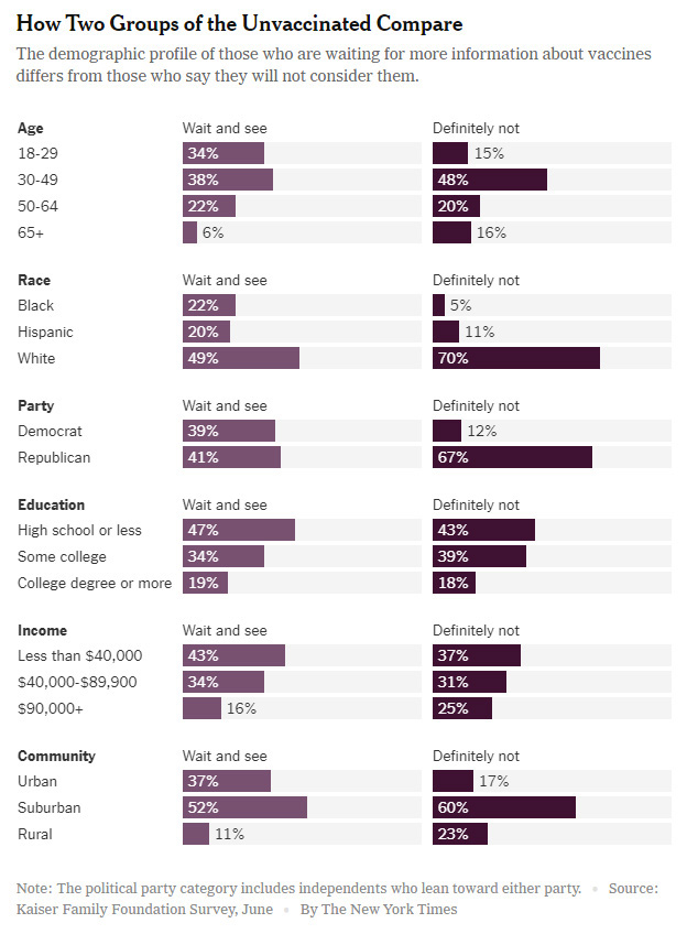 Destroying the media’s one-size-fits-all demonisation of “anti-vaxxers”, the vaccine-hesitant span the spectrum of political affiliation and ethnicity. The Times article features Democrat voters from New York and independents from Oregon, young people from Texas, landscape gardeners and hospital workers.