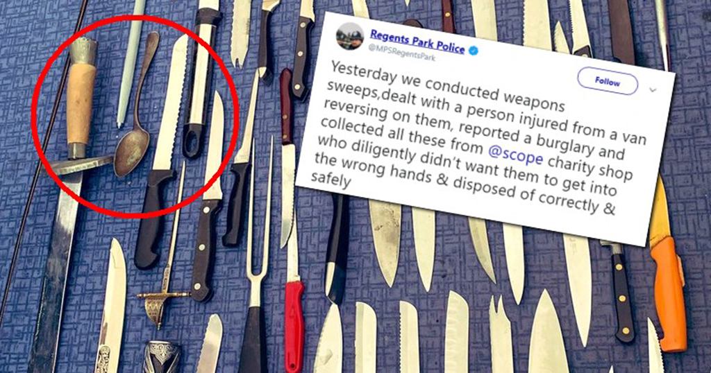 So, terrorists stockpiling massive amounts of explosives are given a pass, and the public kept in the dark, while the Met proudly show off their collection of confiscated, deadly…spoons.