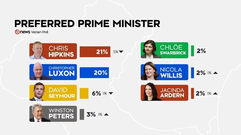 Labour leader Chris Hipkins was the preferred prime minister for 21% of the 1002 eligible voters polled, his worst result since taking over the Labour leadership from Dame Jacinda Ardern in January and a drop of 3% on the last poll.