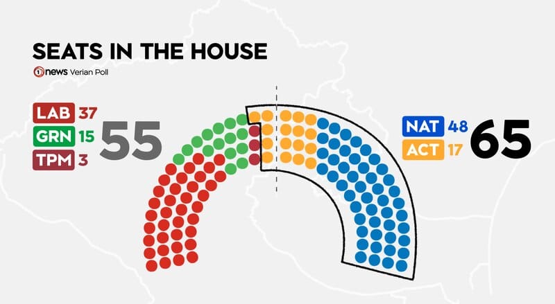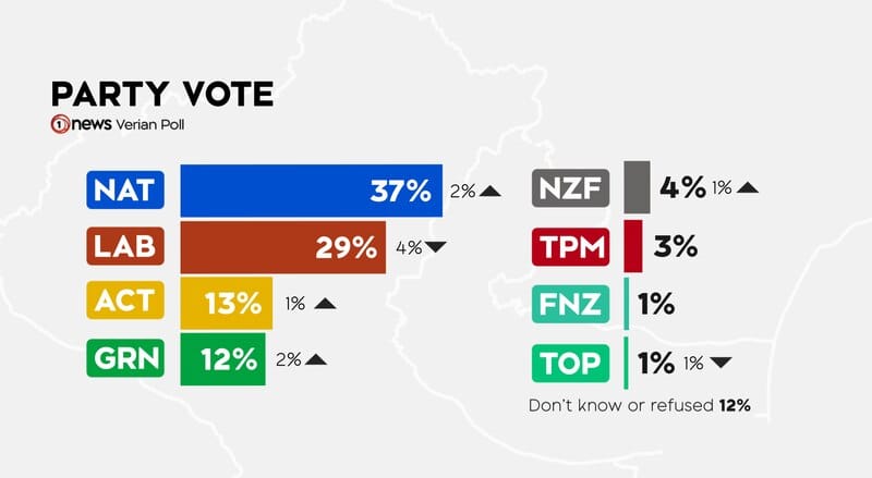 National were on 37% in today’s poll, up 2% on July, while ACT picked up 1% to 13%, and the Greens were up 2% to 12%.