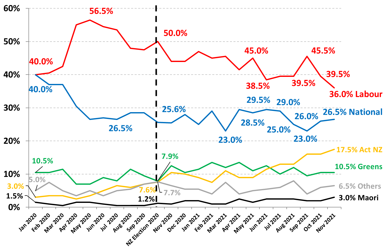 Support for New Zealand’s Labour/Greens ‘coalition’ government was down 3.5% points to 46.5% in November as support for the Labour Party dropped 3.5% points to 36%. Support for the Greens was unchanged at 10.5%. This is the lowest level of support for Labour since the election of the Jacinda Ardern-led Government in October 2017 with 36.9% of the vote.
