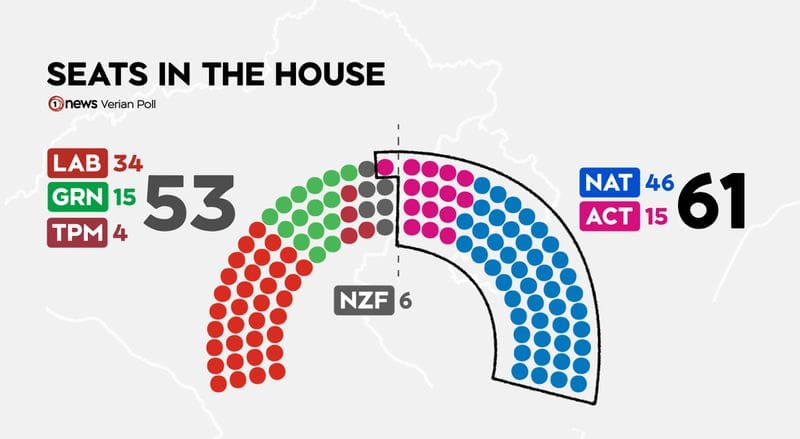 The left bloc falls well short of the numbers required to form a government, with Labour, the Greens and Te Pati Maori’s seats totalling 53.