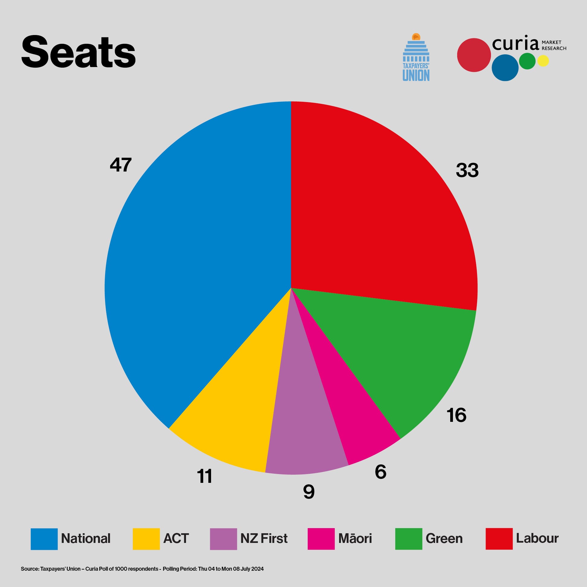 National is up 2.2 points on last month to 37.6% while Labour drops 3.5 points to 25.9%. The Greens are relatively static on 12.5% (-0.2 points) while ACT drops marginally to 9.1% (-0.6 points). New Zealand First is up 1.7 points to 7.3% while Te Pati Maori is down 0.5 points to 3.5%.