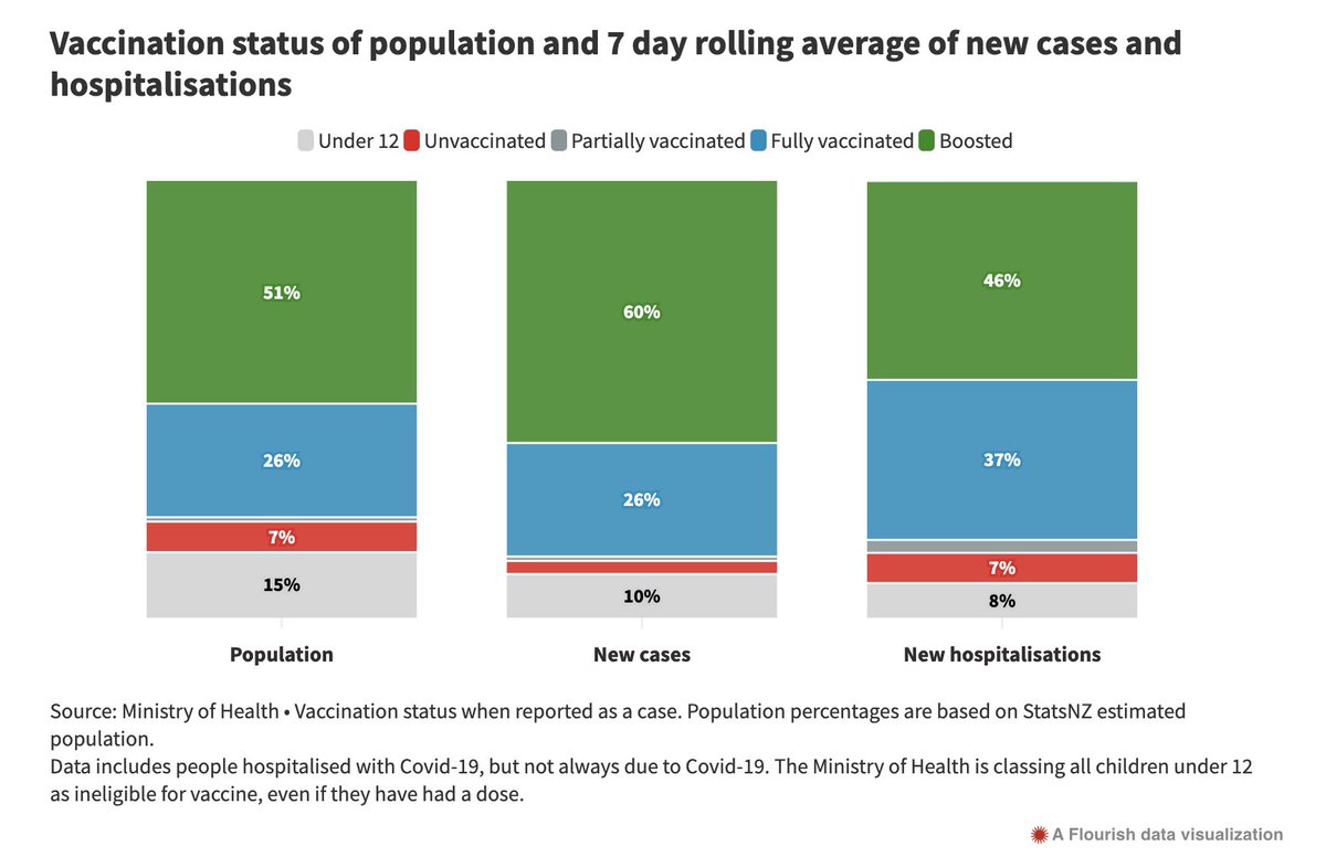 The seven day rolling average shows that 86% of new cases are vaxxed/boosted. It also shows that 83% of hospitalisations are vaxxed/boosted.