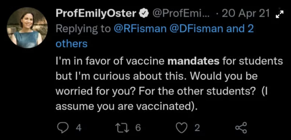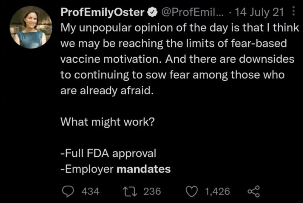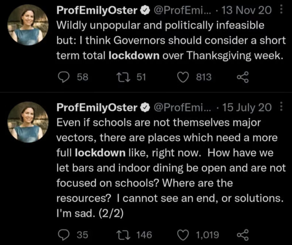 Third, there’s some question as to whether Oster herself really did know better at the time. Like many other mainstream Covid voices, Oster had long been closely attuned to Covid data showing that these mandates did not work, yet she often seemed reluctant to share that data insofar as it contradicted the mainstream orthodoxy that mandates were necessary. In that sense, the policy prescriptions of Oster and those like her may have had less to do with ignorance than with cowardice, tribalism, and “following orders,” which can’t be considered acting “in good faith.”