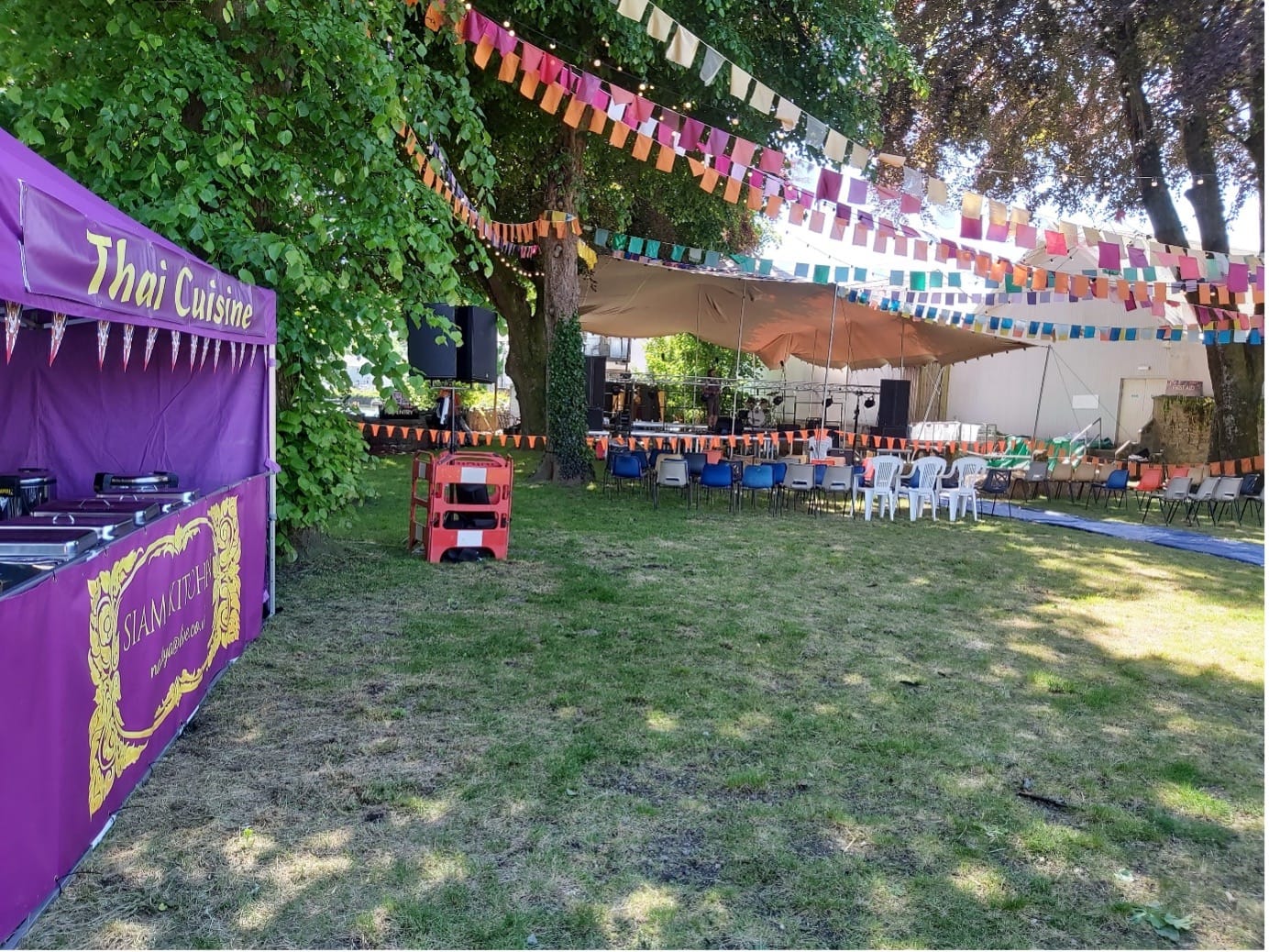 In my part of the country, celebrations started at 4pm with a 6-hour session of songs by the river. An early start saw the gradual arrival of the stall, the stage, and the performers. Weather conditions were perfect, 23°C was just right, with blue skies and no wind. A good selection of food including Thai food, burgers and a pizza and pasta stall. The longest queues were at the mobile bar with prices being reasonable.
