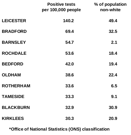 The areas with high populations of BAME are also those where social distancing has been loosely practised, with violent clashes between the police and attendees at informal (and semi-formal!) street events.
