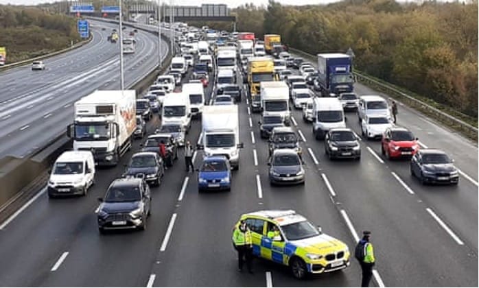 Rich Felgate, a documentary maker, and Tom Bowles, a photographer, were arrested by a Hertfordshire constabulary officer as they caught the action on a footbridge over the M25 on Monday. Felgate said the police had “no interest in seeing press ID and handcuffed us instantly”. “They said they needed to search me for items which could be used to commit criminal damage,” he wrote. “Obviously, they found nothing, so an officer said ‘just arrest them for conspiracy instead then’.”