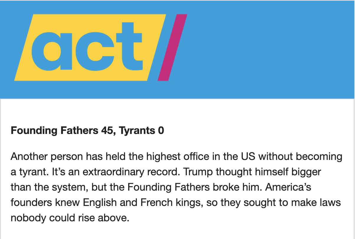 My response to ACT’s November 9 Free Press e-mail is that I am so sick of the lies. If you want to lose a voter keep calling Trump a tyrant.