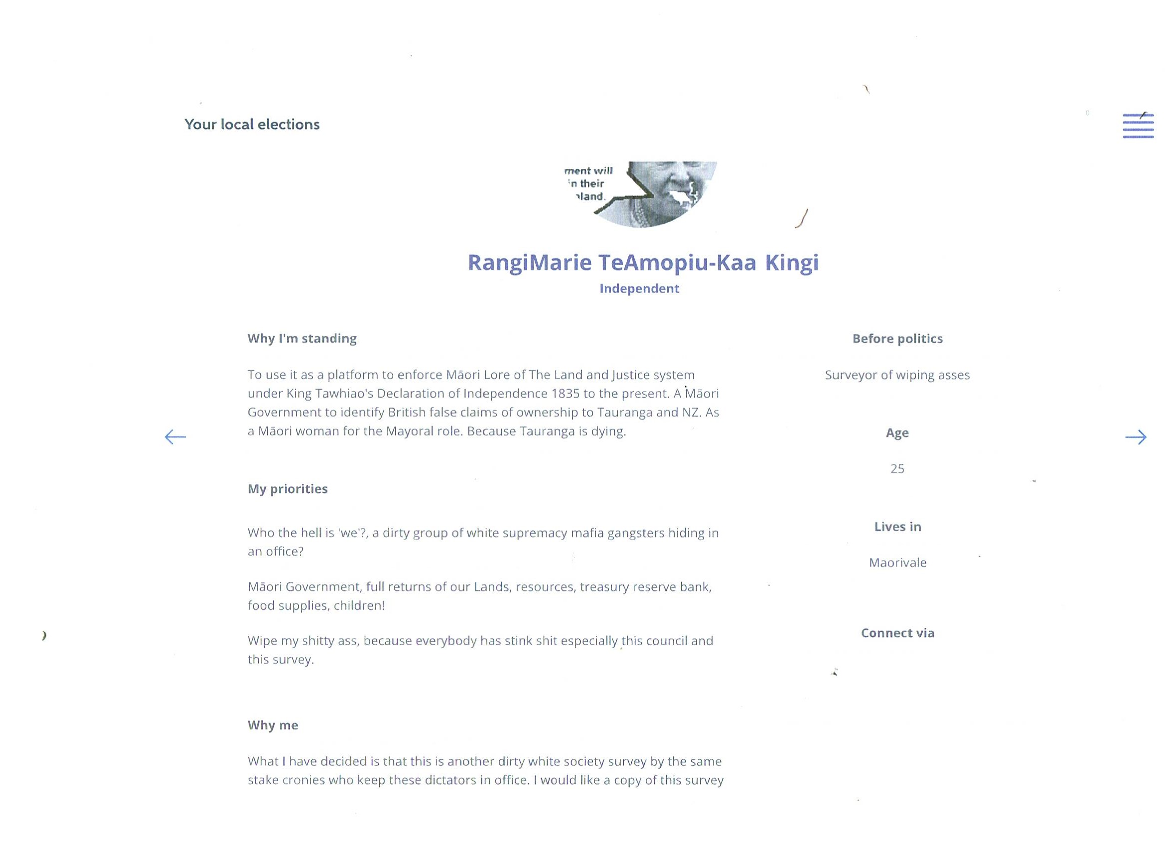 Eureka! I may have found the most obnoxious mayoral candidate profile in the local body elections, standing for Tauranga. Here is her candidate profile as sent out by Council for the current election.