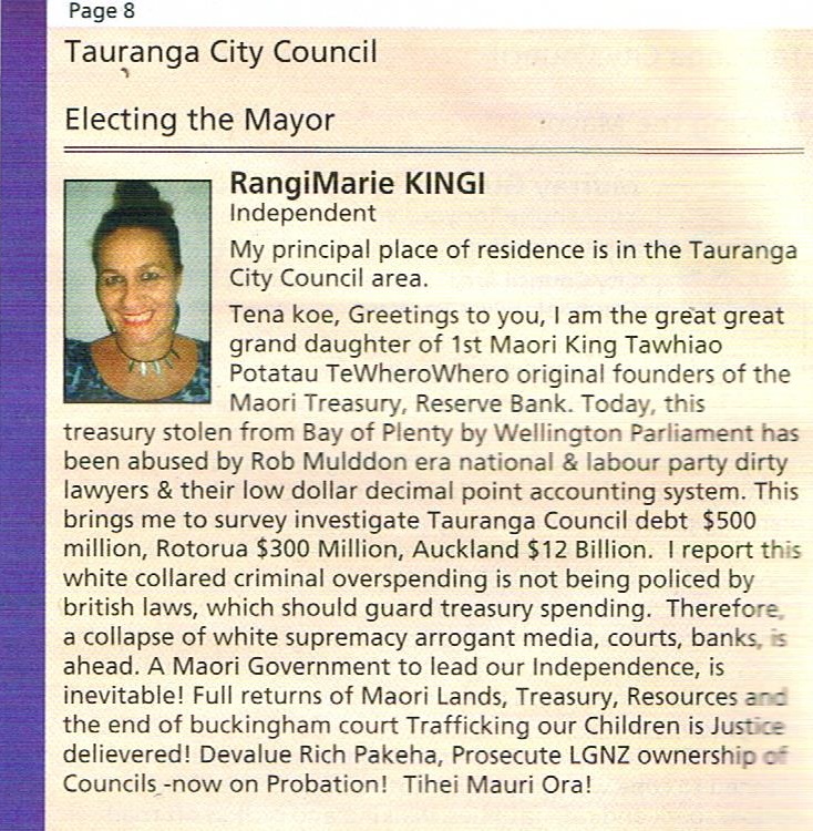 She wants an end to our “white supremacist” government, its replacement with a Maori government, and of course wants to take all the money off the rich Pakeha. She may also be the first mayor who wants to prosecute the Council for existing if she is put in charge of it.