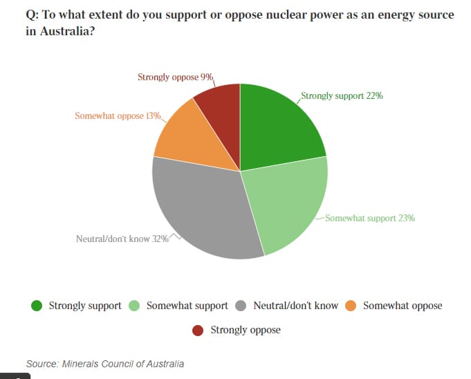 A voter scepticism about nuclear power is rapidly waning. Just over a decade ago, a Lowy poll showed that 62% of Australians were either strongly or somewhat against nuclear power. Only 35% strongly or somewhat supported it. By 2019, Essential reported that that had switched to 44% for, 40% against.