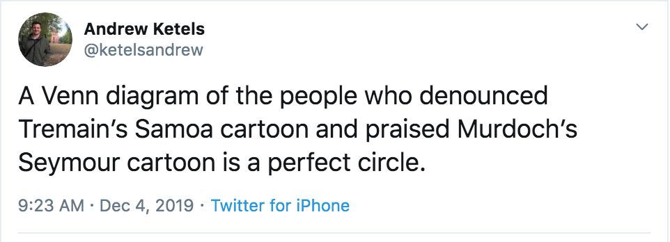 Of course when cartoons are offensive to white people or mock conservatives or right-wing politics (ie most cartoons in NZ papers today), then no one cares, no one loses their job and the very same people beating their chests now have a snigger into their soy lattes.