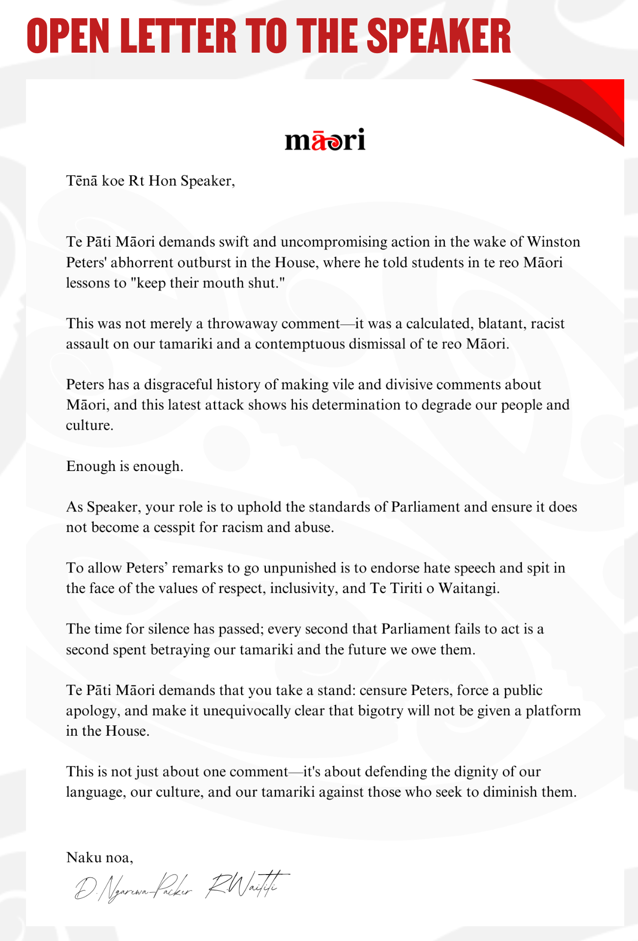 Te Pāti Māori has written to the Speaker to demand “swift and uncompromising action” following what they call an “abhorrent outburst” from Winston Peters in the House.