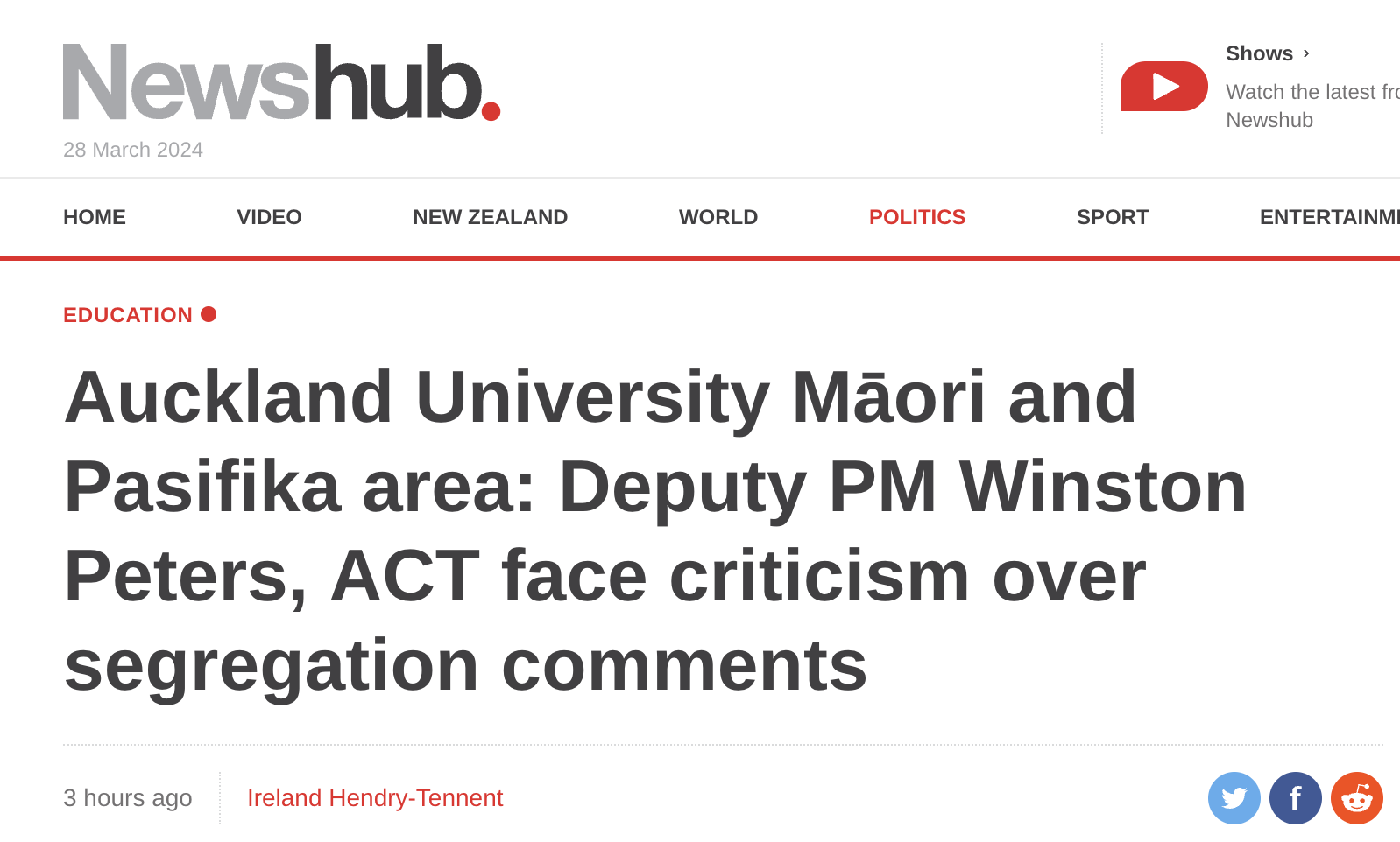 Newshub is stoking the fires against David Seymour and Winston Peters, expressing outrage about what both have said about the appalling segregation occurring at Auckland University. Their headline screams they are facing criticism: