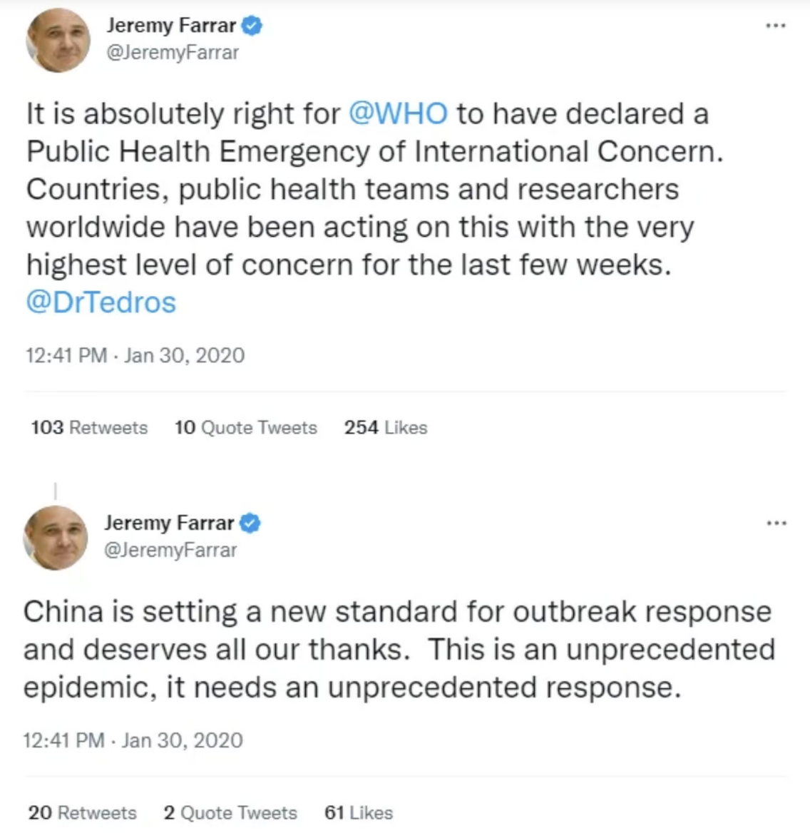 Shortly after Xi Jinping enacted the strictest lockdown in history in Wuhan, China, and long before that lockdown produced any results, Farrar echoed his new boss, Tedros, in praising China for “setting a new standard for outbreak response”.