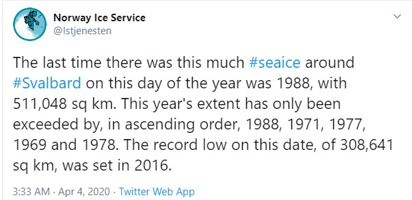 “The last time there was this much #sea ice around #Svalbard on this day of the year was 1988, with 511,048 sq km. This year’s extent has only been exceeded by, in ascending order, 1988, 1971, 1977, 1969 and 1978.“